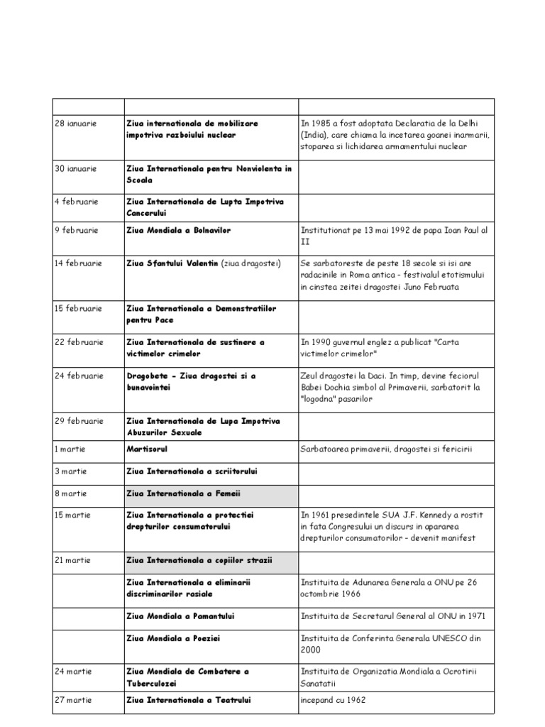 De asemenea, în listă sunt trecute și săptămâni sau luni cu semnificație internațională.